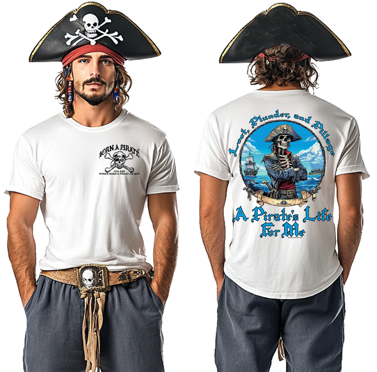 If you are looking for Pirate T-Shirts, check out our line of “Born A Pirate” tees! These t-shirts feature great original copyrighted artwork/graphics by our talented in-house artists. These designs are new, and exclusive to our brand, and not made from boring clip art. The quality and printing is on another Level!